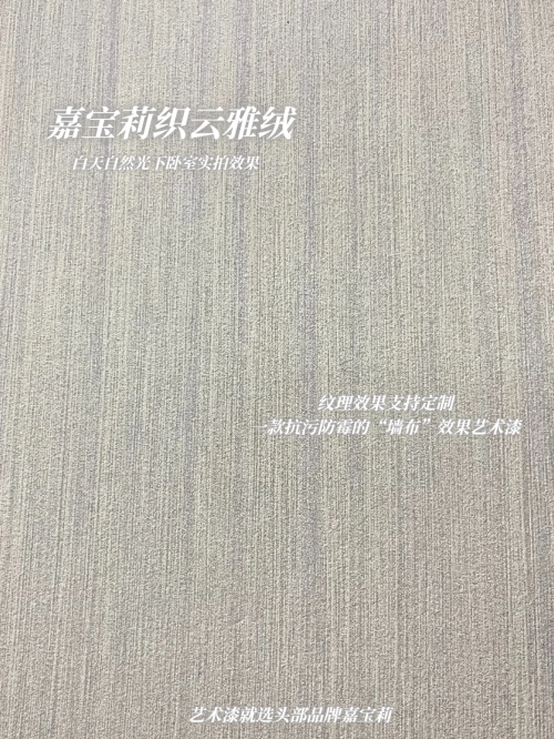 想要壁纸效果,又担心环保、清洁、耐用问题?嘉宝莉织云雅绒还具备耐磨耐擦的特性,高强度耐磨配方,有效抵抗日常生活中的刮擦与磨损,保持墙面长久如新。抗污抗脏能力显著,优异的抗污性能,轻松应对油渍、水渍等常见污渍,一擦即净,省心省力。通过不同的施工手法,可实现多种装饰效果,如仿布纹、仿石纹等,满足多样化的审美需求。而且还能确保环保净味,采用低VOC(挥发性有机化合物)配方,施工及使用过程中几乎无异味,守护全家人的健康。
