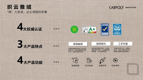 除了超越壁纸的效果,嘉宝莉织云雅绒艺术涂料在环保性能上也达到了行业领先水平,通过了中国环境标志产品认证、FDA食品接触级标准、法国室内环境空气检测A+标准及欧盟REACH等四大国际权威认证。这些认证不仅是对产品环保性的高度认可,更是对消费者健康负责的承诺,让每一次呼吸都充满清新与安心。
